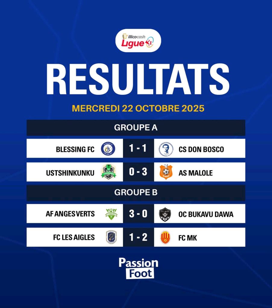 Dans le Groupe A, Blessing FC et CS Don Bosco se sont séparés sur un nul (1-1), tandis que l’US Tshinkunku a perdu par forfait (0-3) contre l’AS Malole.