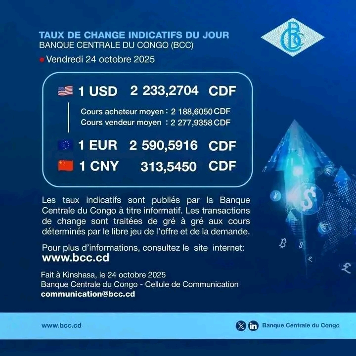 Selon les indicatifs du taux de change de la Banque centrale du Congo, BCC, la monnaie nationale se change ce vendredi 24 octobre à 2.233 CDF le dollar, contre 2.181,la veille.