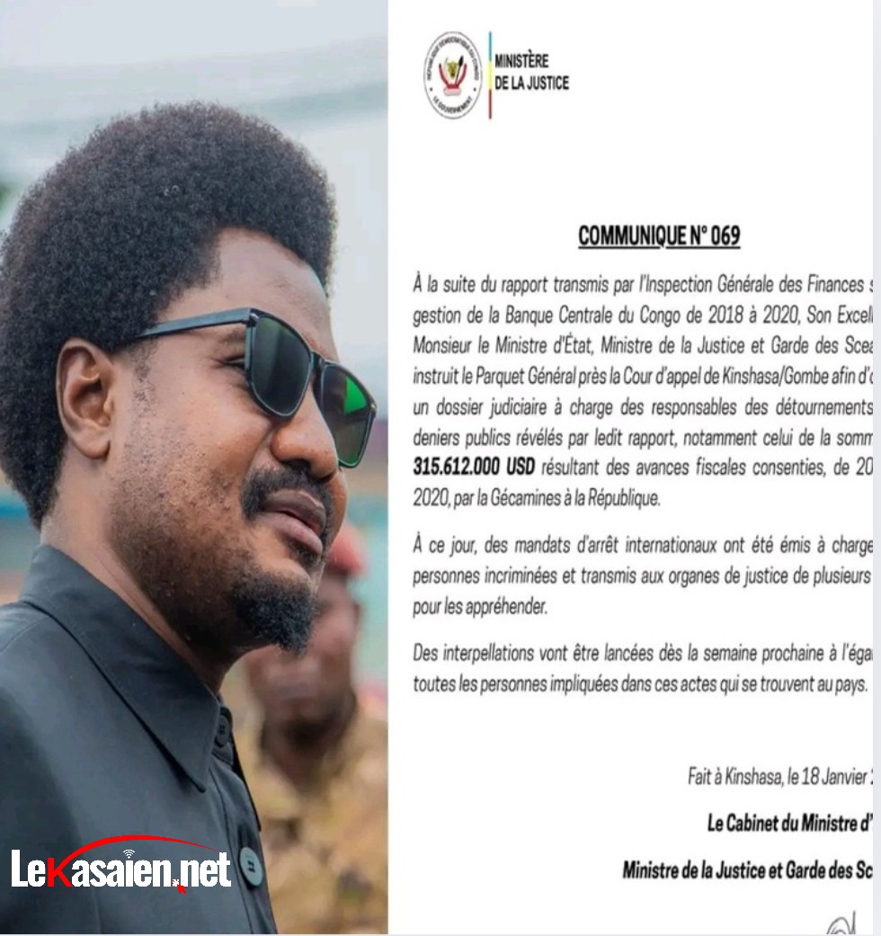 Le Ministre d’État, Ministre de la Justice et Garde des Sceaux, Constant Mutamba, instruit le Parquet Général près la Cour d’appel de Kinshasa/Gombe afin d’ouvrir un dossier judiciaire à charge des responsables de détournements de fonds publics à la Banque centrale du Congo, notamment 315,6 millions de USD issus des avances fiscales de la Gécamines entre 2012 et 2020.
